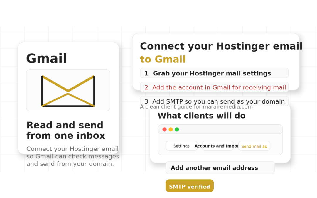 Manage your Hostinger email inside Gmail so you can read messages, reply from your domain, and keep everything in one clean inbox.Read Everything in Gmail