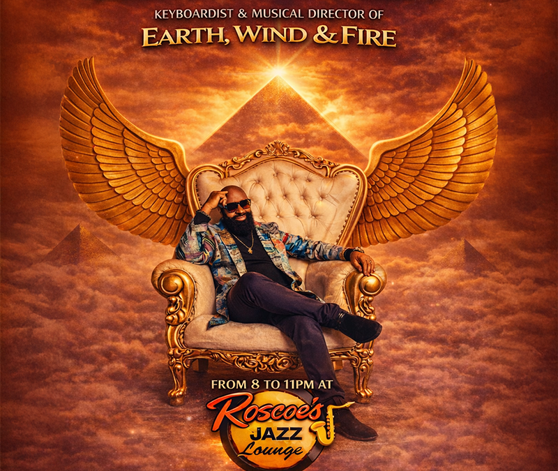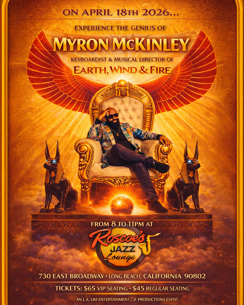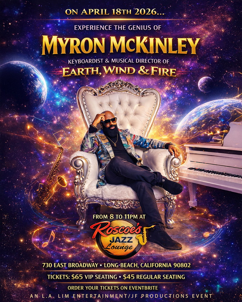 This creative project was developed to promote the upcoming live performance of legendary keyboardist Myron McKinley, musical director of Earth, Wind & Fire, appearing April 18th, 2026 at Roscoe’s Jazz Lounge in Long Beach, California.